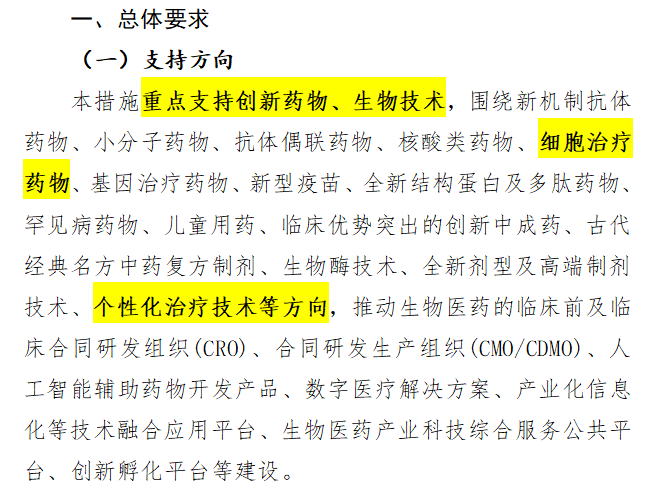《措施》總體要求,重點支持創(chuàng)新藥物、生物技術(shù),圍繞…細胞治療藥物、基因治療藥物、新型疫苗……個性化治療技術(shù)等方向的發(fā)展。