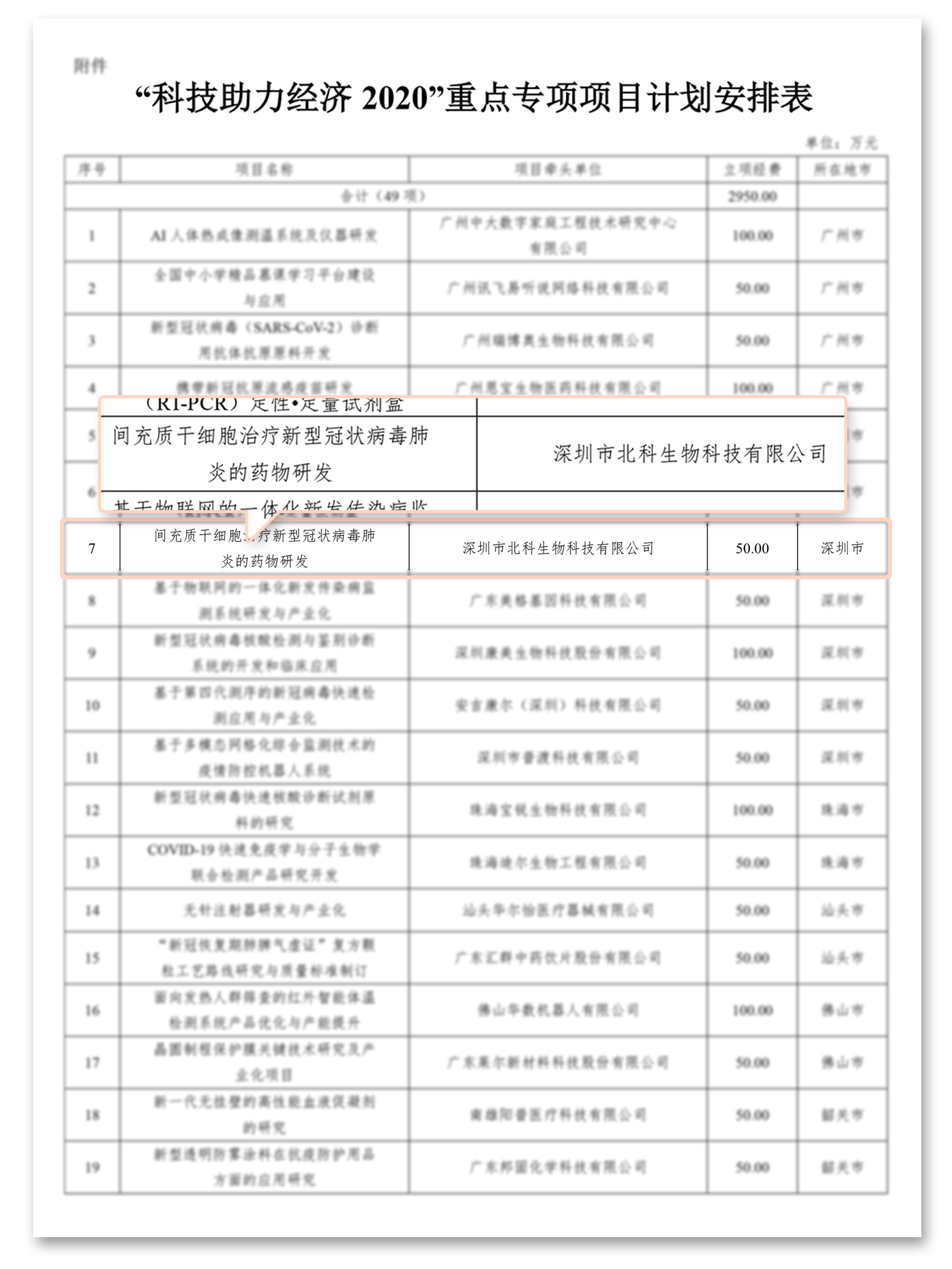 日前,由科技部支持的一批覆蓋國民經(jīng)濟主要行業(yè)的技術(shù)創(chuàng)新項目陸續(xù)“揭榜”,廣東省科技廳正式發(fā)布了《廣東省科技廳關(guān)于下達2020年“科技助力經(jīng)濟2020”重點專項項目計劃的通知》,其中深圳市北科生物科技有限公司(以下簡稱“北科生物”)牽頭的《間充質(zhì)干細胞治療新型冠狀病毒肺炎的藥物研發(fā)》成功入選,獲“廣東省科技助力經(jīng)濟2020”重點專項推薦項目。