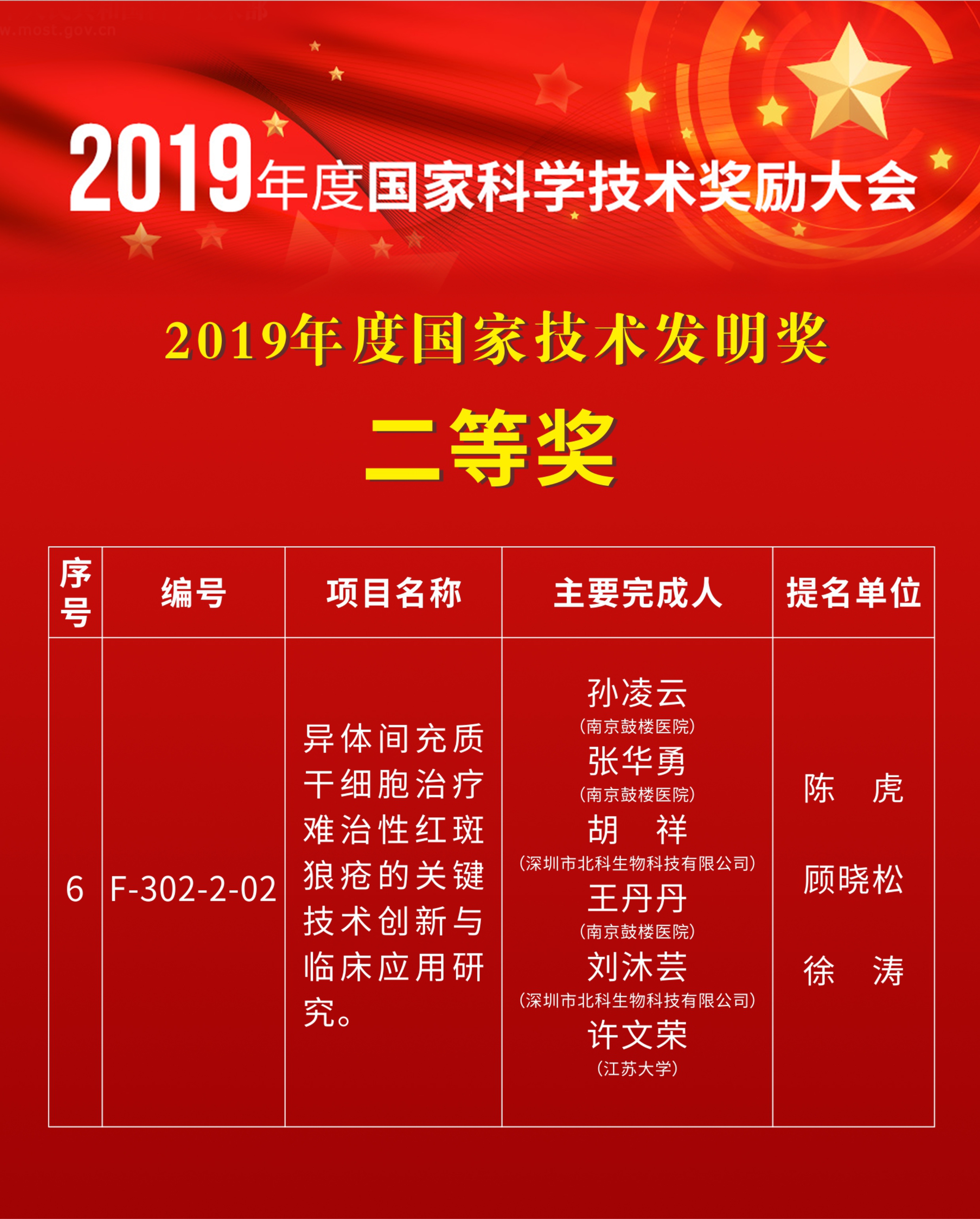 2020年1月10日,中共中央、國(guó)務(wù)院在北京舉行2019年度國(guó)家科學(xué)技術(shù)獎(jiǎng)勵(lì)大會(huì),這是科技界一年一度的盛宴,是中國(guó)科技界的最高榮譽(yù),是黨和人民對(duì)科技工作者的最高褒獎(jiǎng)。南京大學(xué)醫(yī)學(xué)院附屬鼓樓醫(yī)院風(fēng)濕免疫科孫凌云,張華勇,深圳市北科生物科技有限公司胡祥、鼓樓醫(yī)院王丹丹、北科生物劉沐蕓、江蘇大學(xué)許文榮等共同完成的成果“異體間充質(zhì)干細(xì)胞治療難治性紅斑狼瘡的關(guān)鍵技術(shù)創(chuàng)新與臨床應(yīng)用研究”榮獲國(guó)家技術(shù)發(fā)明二等獎(jiǎng)。